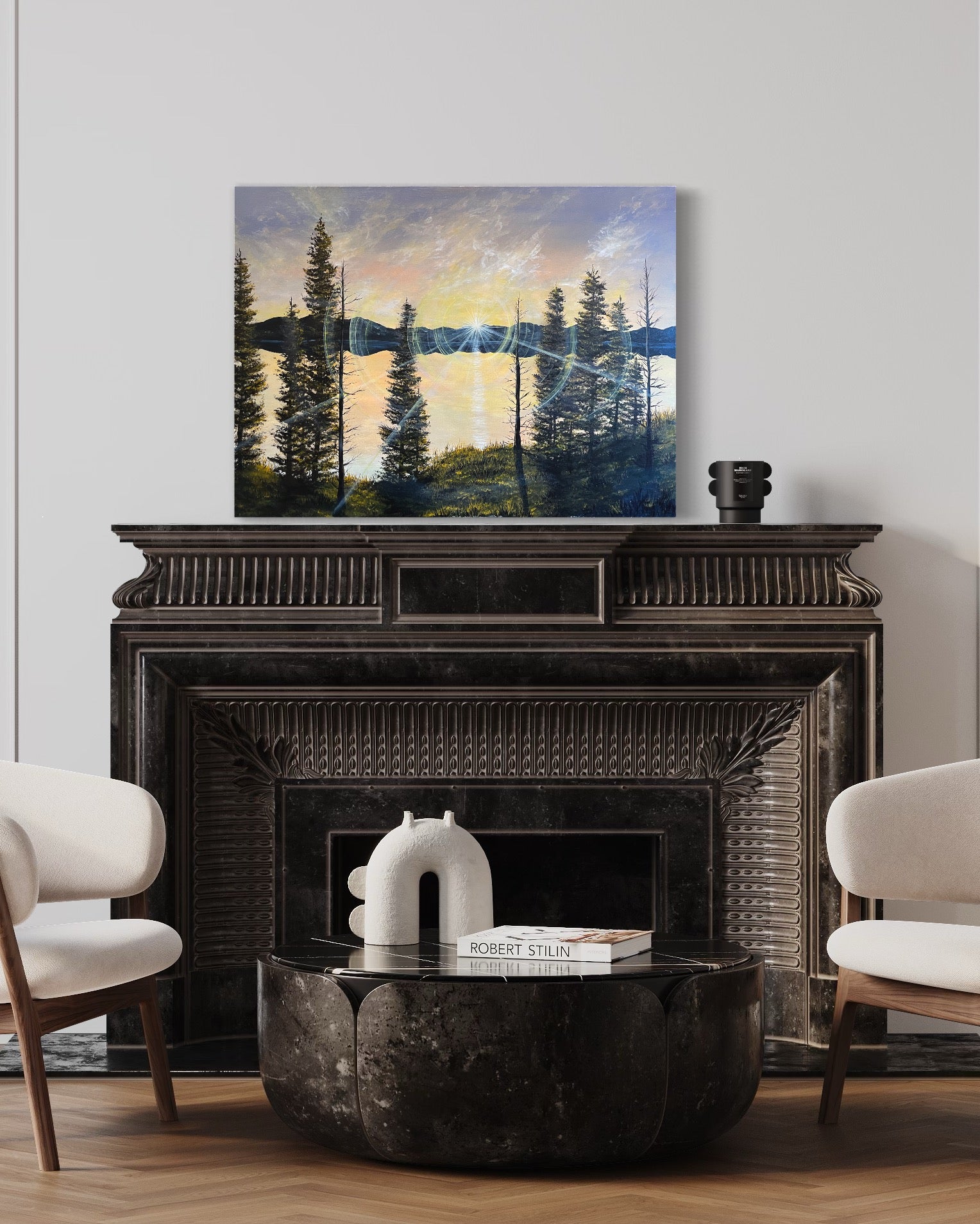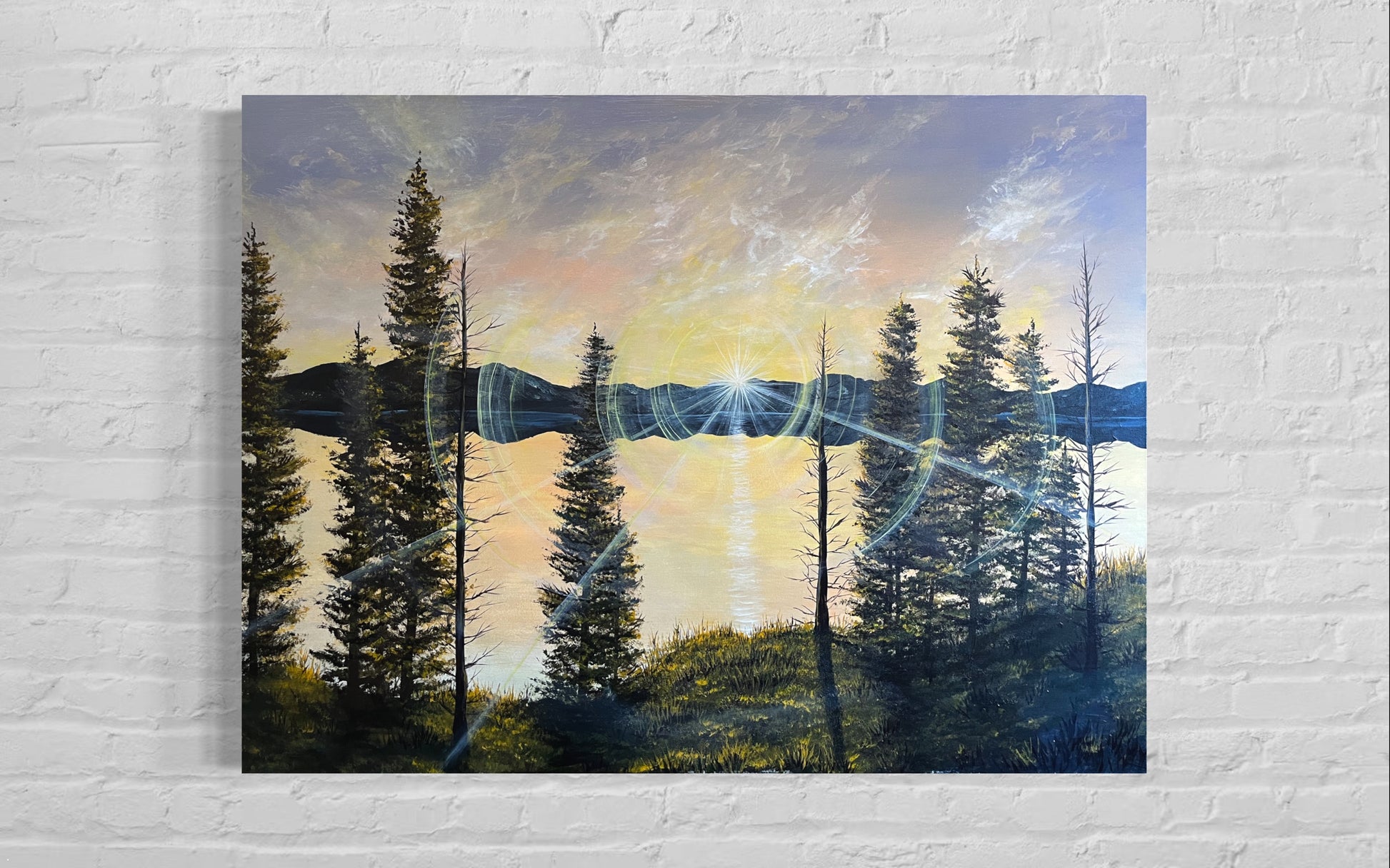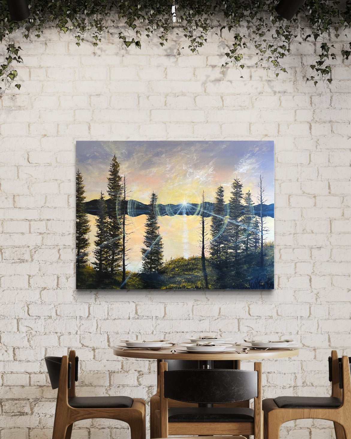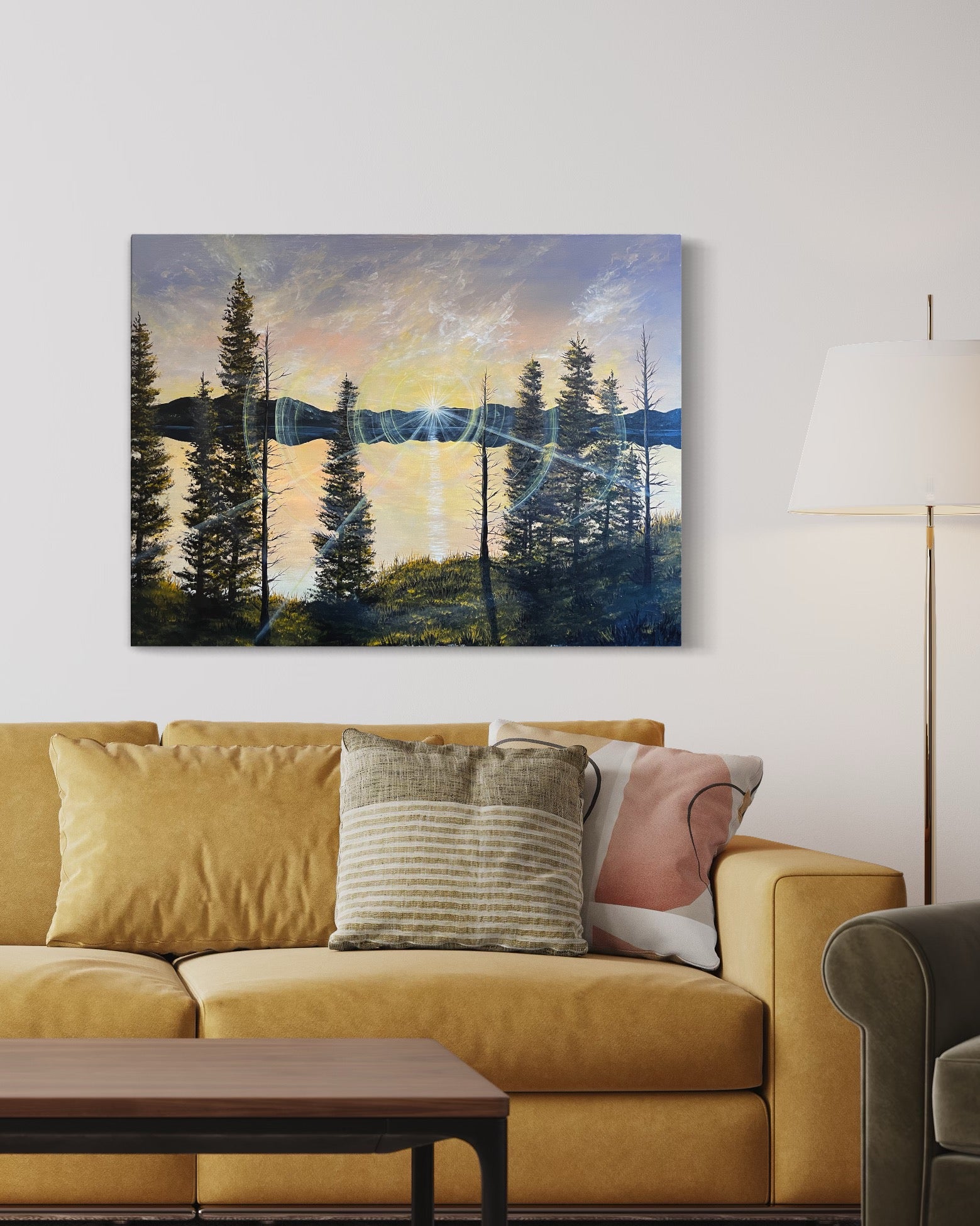 Unique acrylic artwork on 30x40in gallery canvas. Ready to hang with hardware installed and art wrapped edges.