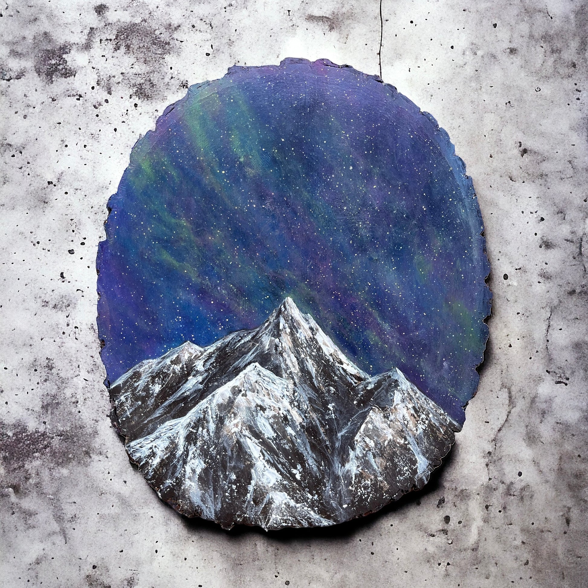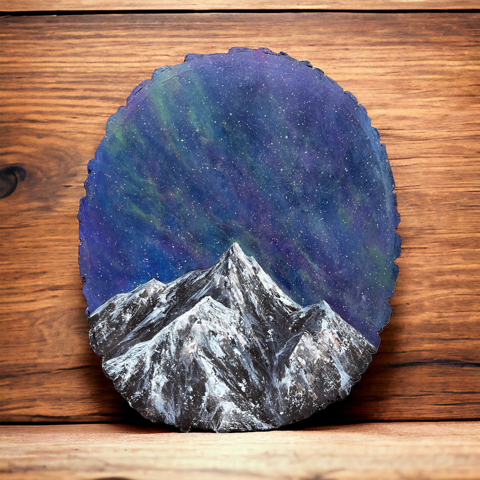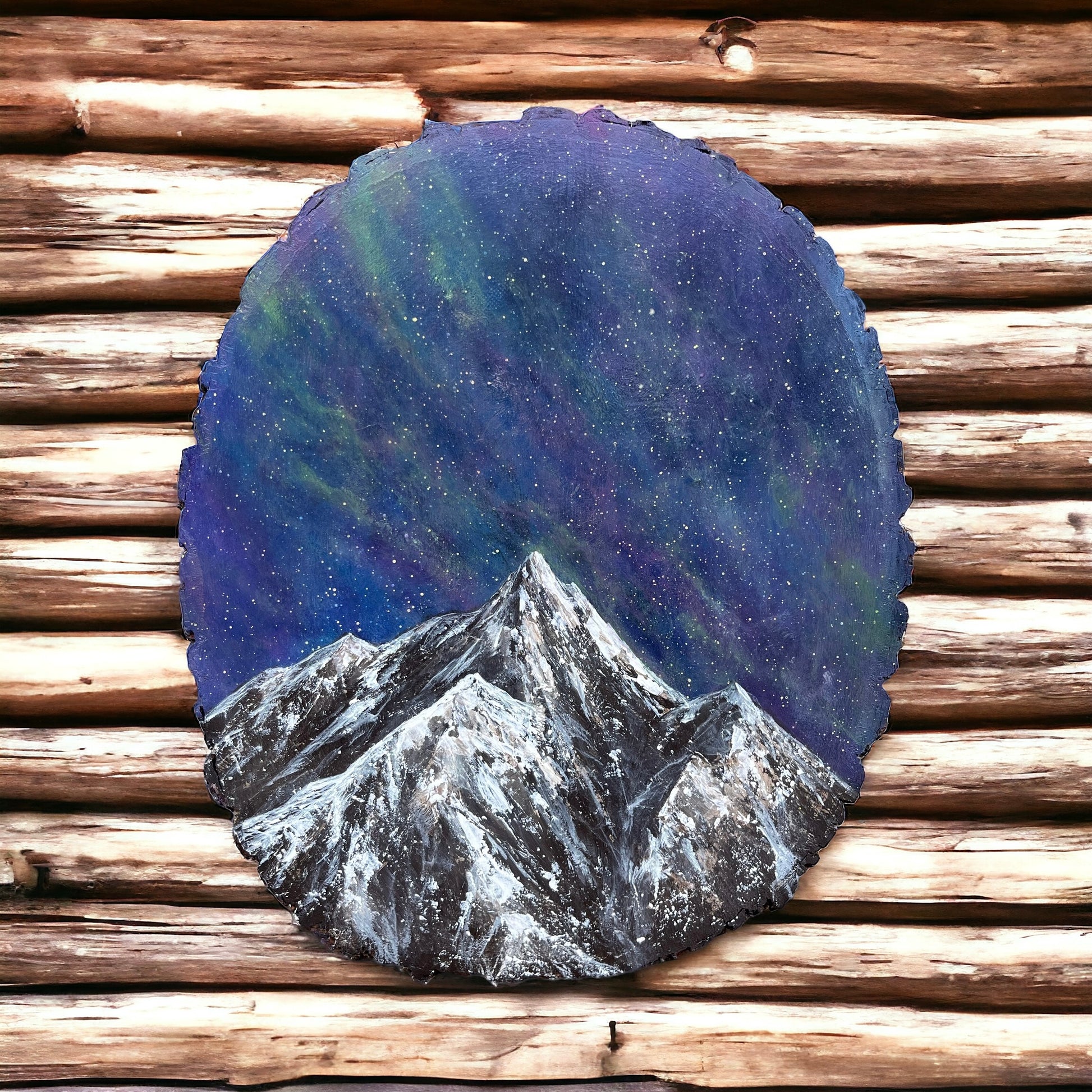 “Arctic Serenity” captures the majestic beauty of a starry night sky looming over a snow-capped peak, all portrayed on a unique wood slice canvas. The painting transports viewers to a serene and remote wilderness, where the crisp night air is filled with the shimmering glow of countless stars. The snow-covered mountain rises proudly against the dark expanse, its slopes glistening under the moonlight. The raw, organic texture of the wood slice adds an extra layer of depth and authenticity to the scene, inviting viewers to immerse themselves in the tranquility and wonder of the natural world.