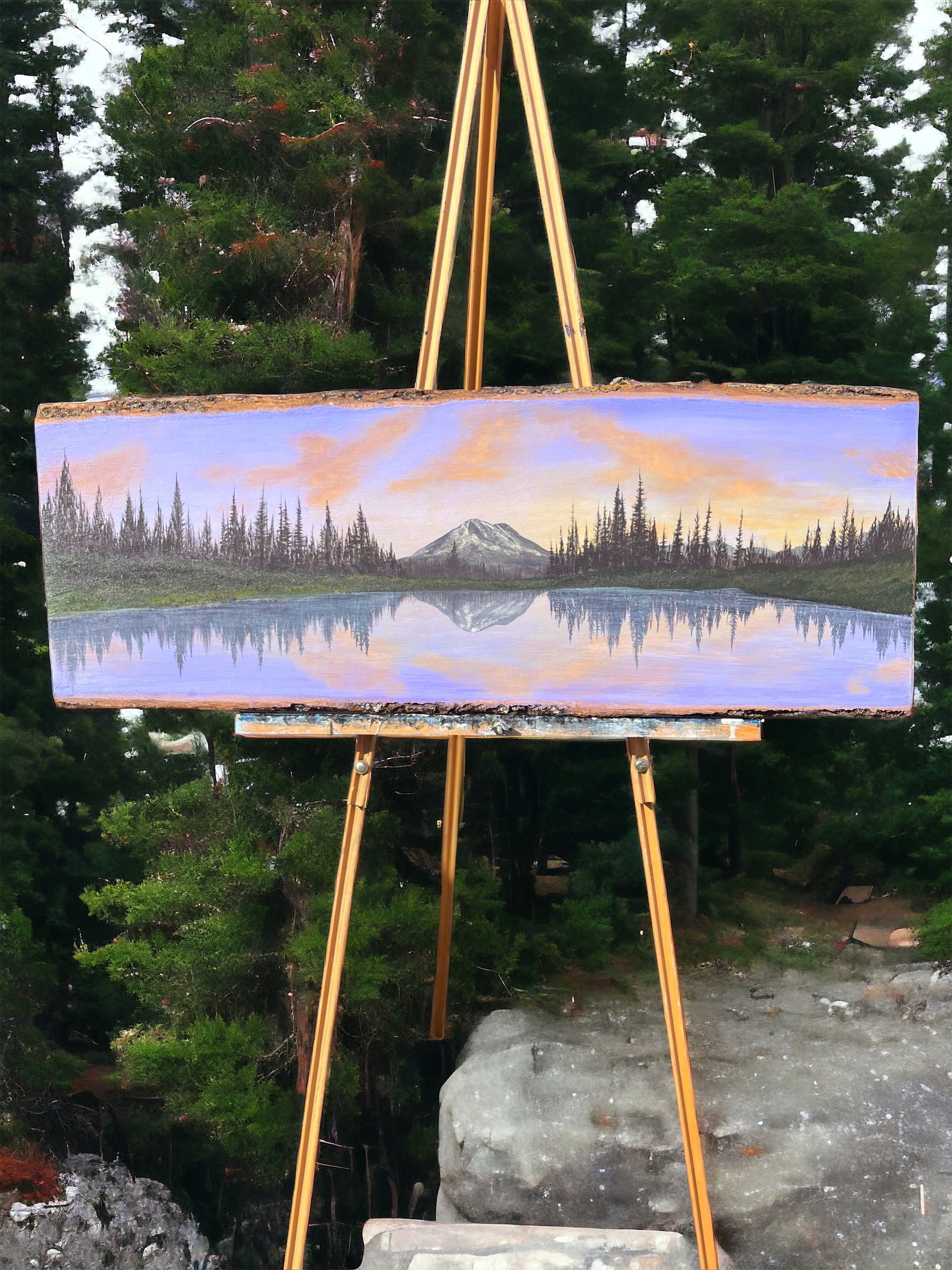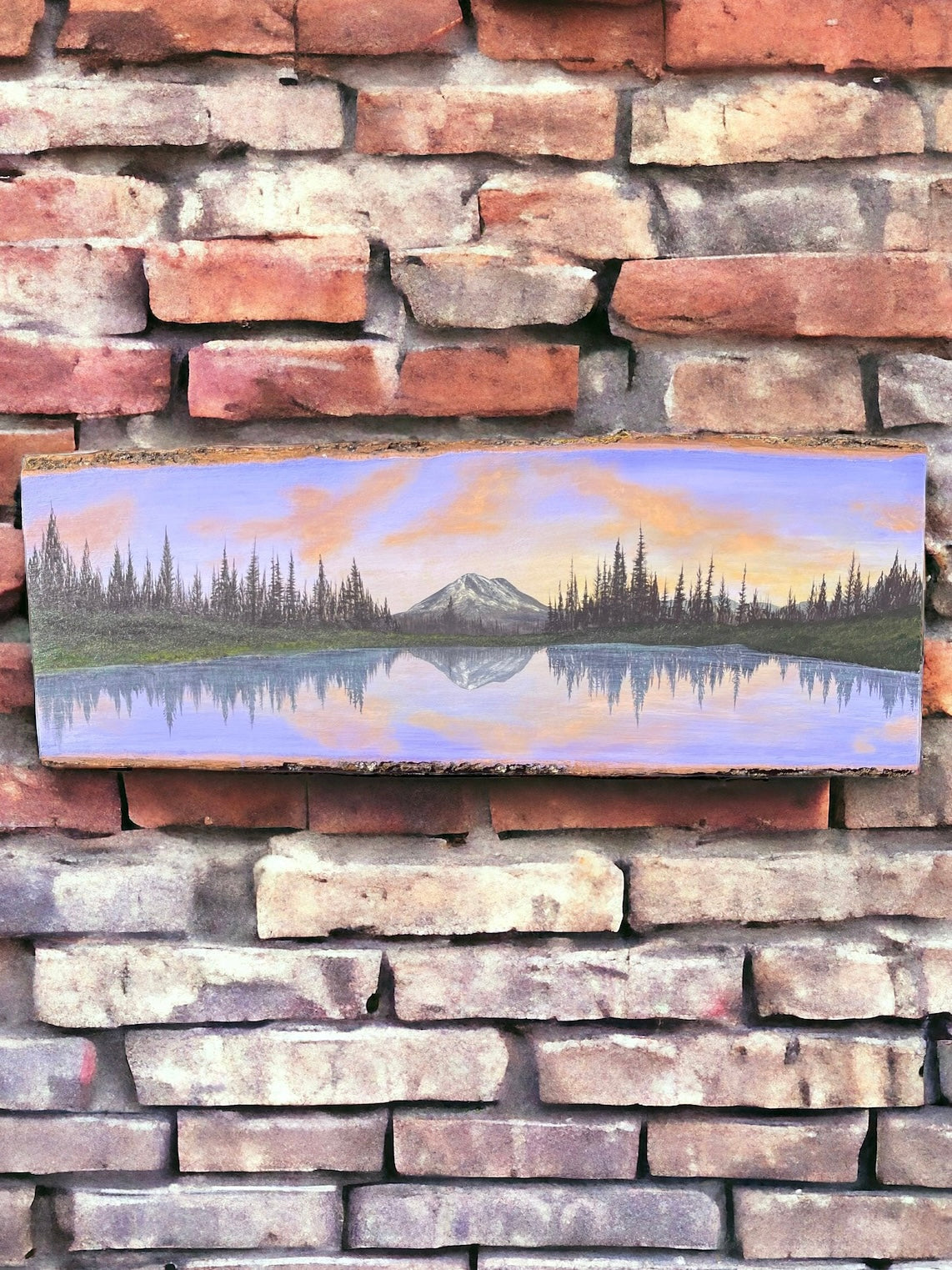 Introducing this enchanting original painting on a raw wood slice, where whimsical skies meet majestic mountains and lush trees. This unique artwork transports you to a serene lakeside scene, where nature’s beauty is captured in every brushstroke. The rustic charm of the wood slice adds depth and character, making it a standout piece for any home or office. Let the tranquil reflections on the lake inspire your imagination and bring a touch of the outdoors into your space. Elevate your decor with this one-of-a-kind masterpiece that celebrates the magic of nature.