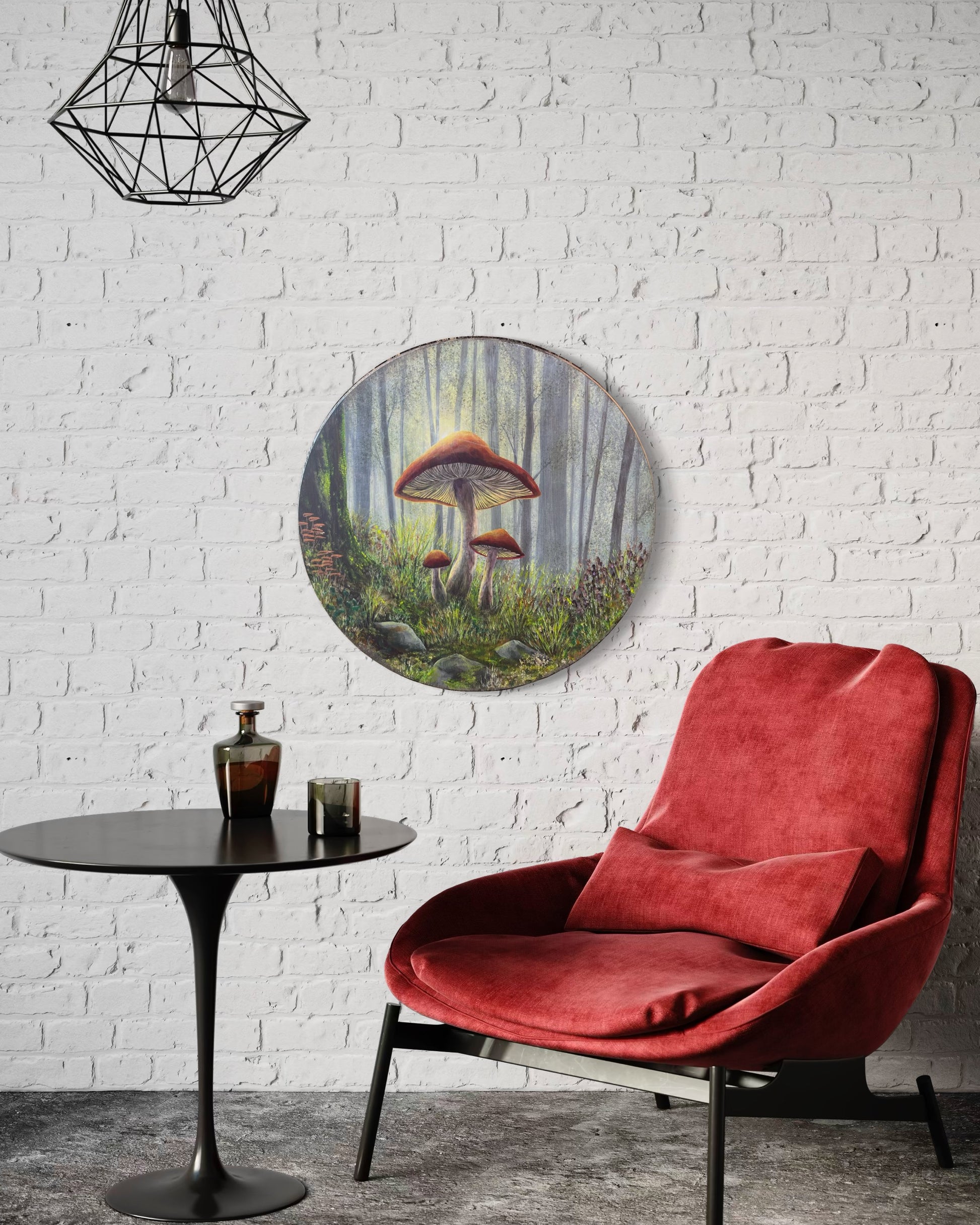 “Forest Reverie” is an original acrylic painting on a 24-inch round wood panel, capturing a quiet moment of wonder in the heart of the forest. Three mushrooms stand gently in the foreground, bathed in warm golden light as the sun peeks out from behind the largest cap. Towering trees rise in the background, softened by atmospheric light and earthy tones.