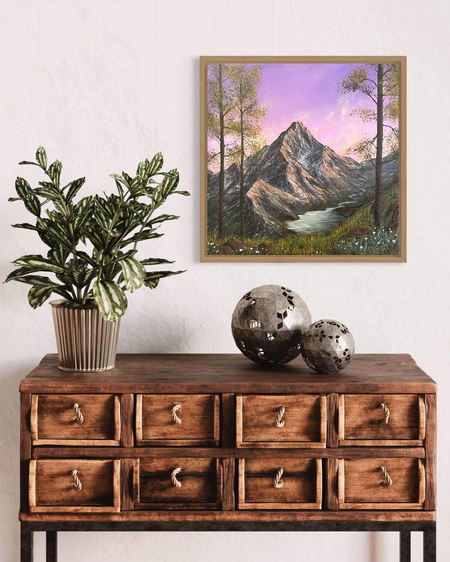 Handpainted artwork on 16x16in canvas in a Chilean Pine floating frame.