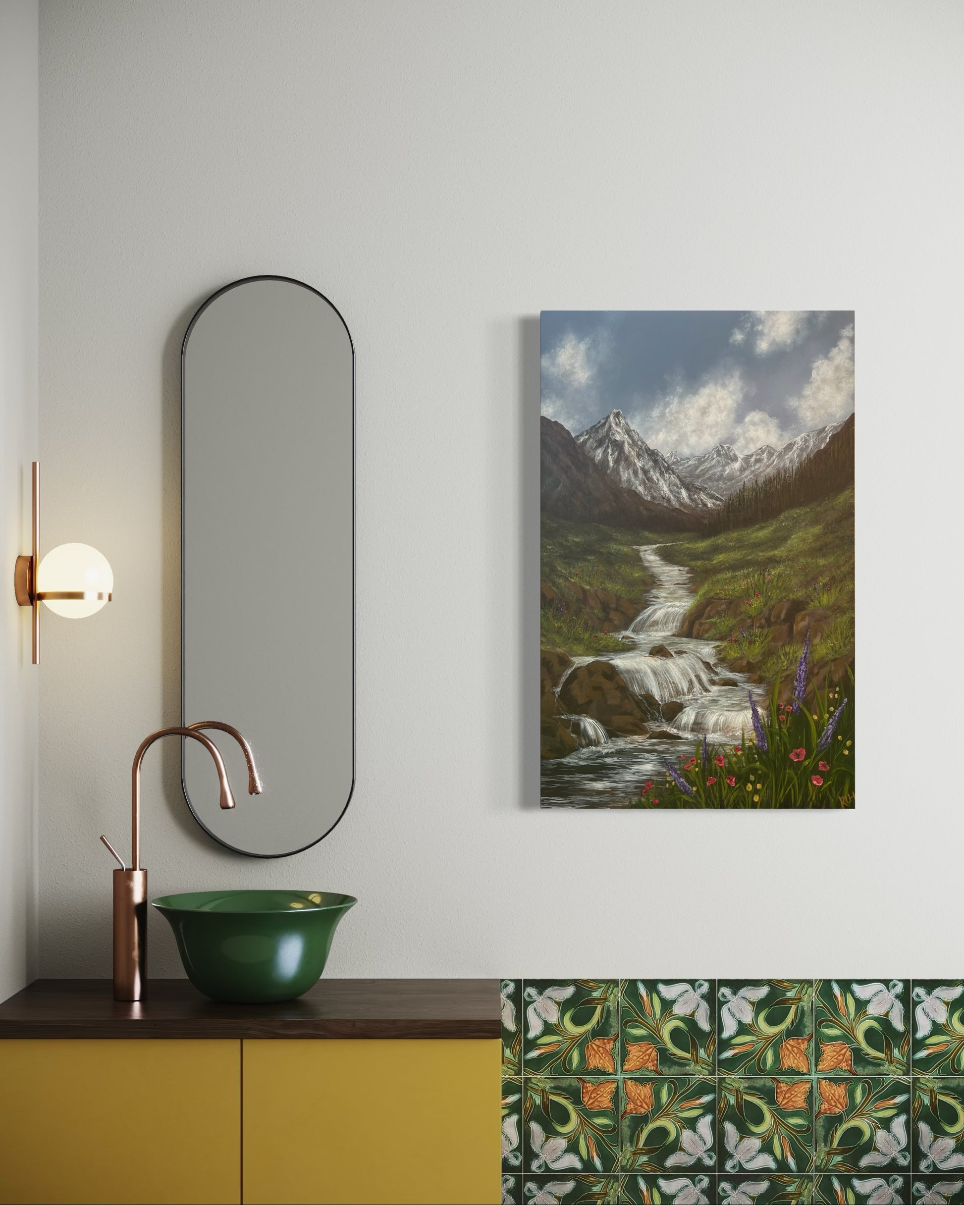 Mountain Whisper invites you into a tranquil alpine scene where earth and sky meet in quiet harmony. Soft, cloudy blue skies hover above majestic snowy peaks, their strength mirrored in the winding river that flows all the way to the foreground. At the river’s edge, vibrant wildflowers bloom in delicate contrast to the cool tones of mountain and sky, reminding us of resilience and fleeting beauty in rugged landscapes.