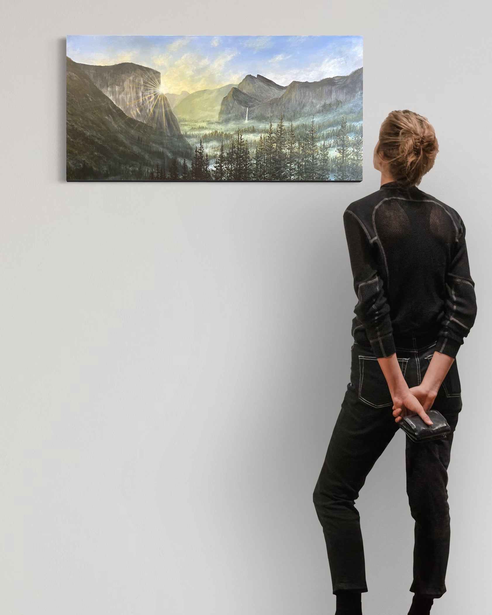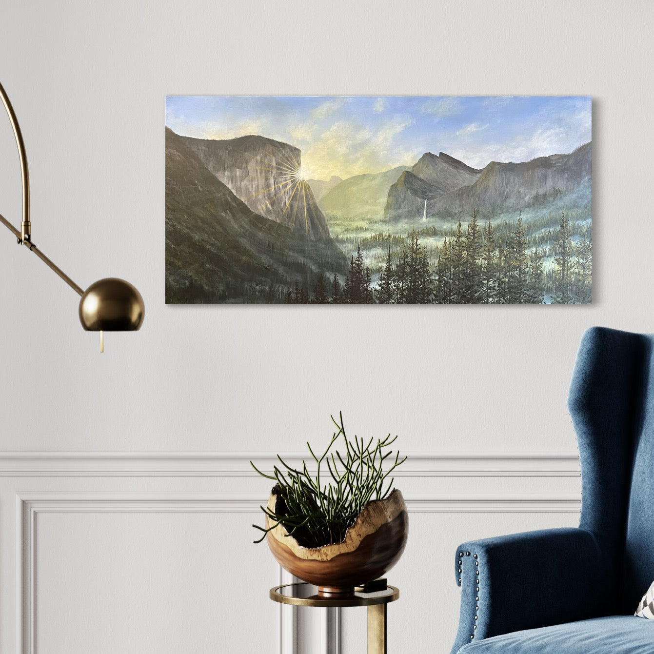Step into the ethereal beauty of nature with 'The Valley,' a captivating landscape masterpiece that brings Yosemite Valley to life on a stunning 20x40-inch gallery canvas. This unique artwork intricately captures the majestic allure of the valley, showcasing its grandeur, serenity, and timeless allure. With intricate brushstrokes and a harmonious blend of colors, this painting invites you to immerse yourself in the tranquil depths of nature, evoking a sense of wonder and awe. 'The Valley' is not just a painting; it's a portal to the breathtaking landscapes of Yosemite, a timeless addition to any art collection that resonates with the soulful beauty of the great outdoors.