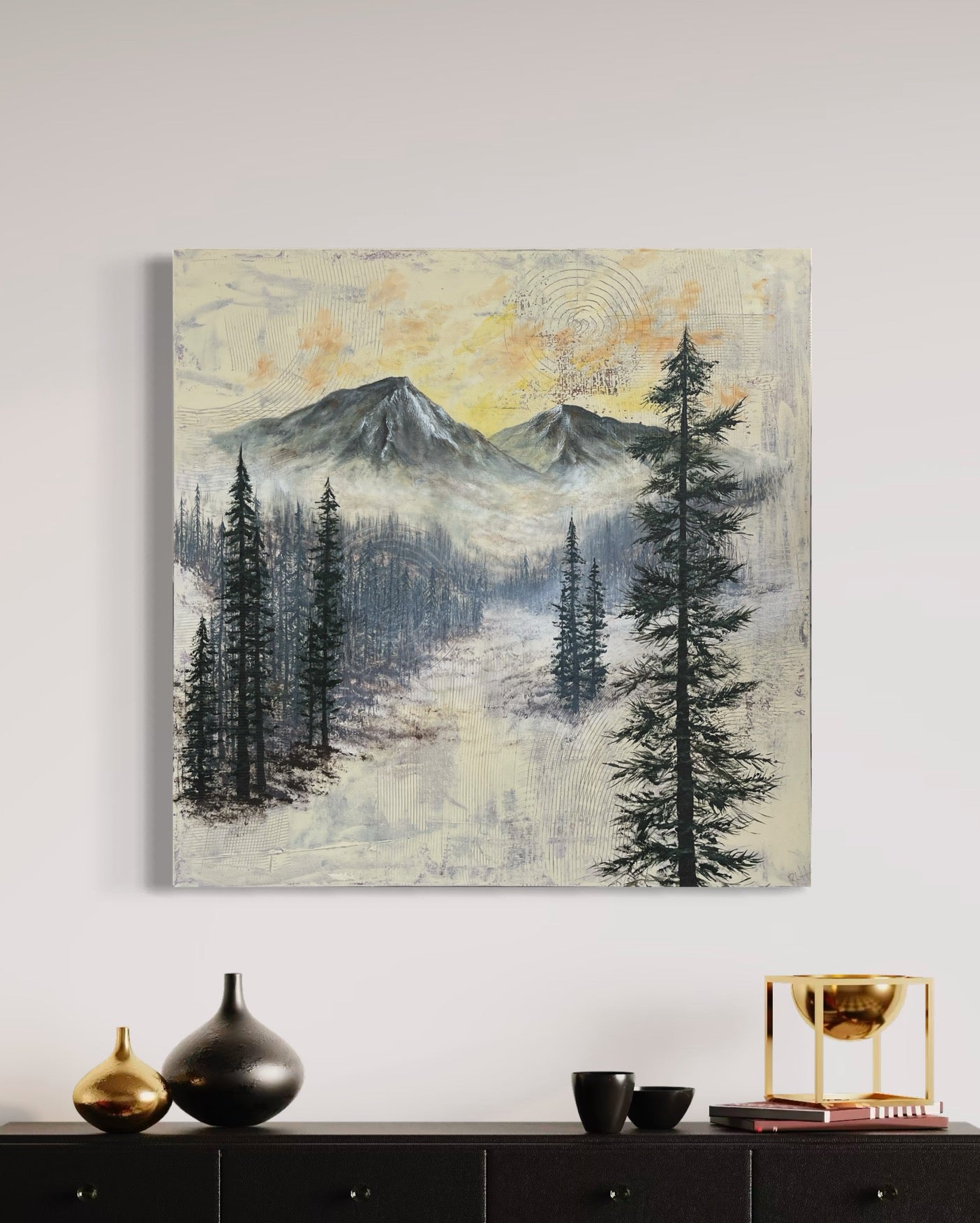 This serene landscape, invites the viewer into a moment of stillness and reflection. Whisper is inspired by Psalm 46:10 — “Be still, and know that I am God.” Layers of texture and delicate color blending together evoke the quiet peace found in nature’s calm.